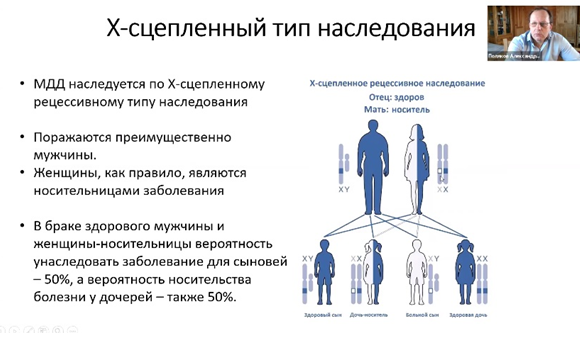 «В связи с таким типом наследования мамам, чтобы в будущем родить здорового ребенка, бесполезно менять своего партнера. Так как ген передает не мужчина. У нас в девяностых-двухтысячных годах было много подобных случаев, когда женщина не верила врачу, меняла папу, и от него снова рожала больного мальчика. Буквально еще 20 лет назад на конференциях по миодистрофии Дюшенна можно было услышать, что „если у мамы больного МДД при последующей беременности на УЗИ определяли мужской пол у плода, то врач советовал прервать беременность“. Надеюсь, это осталось в прошлом. В семье, где мама носительница, половина мальчиков будут больны, и половина девочек будут носителями. То есть, если взять умозрительную ситуацию, при которой в браке родится 1000 детей, 250 сыновей из них будут больны, 250 здоровы, 250 дочек будут носительницами, и 250 девочек будут здоровы. Если в семье четверо мальчиков, то все они могут быть здоровы, и никогда семья не узнает, что мама была носительницей. Или наоборот — все четверо сыновей могут быть больны. Нужно понимать, что если вы родили ребенка с ММД, это не значит, что следующий малыш будет здоров. При каждой последующей беременности риск все равно равен ½», — объясняет Александр Поляков.