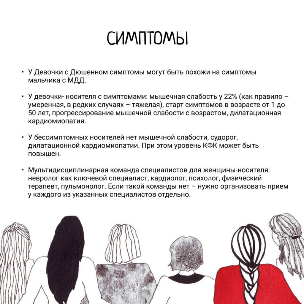 ‼️Важно понимать, что женщины и девочки-носители МОГУТ иметь симптомы: от утомляемости при интенсивных физических нагрузках до мышечной слабости, могут быть проблемы с сердцем и нюансы, связанные с поведением и обучением.