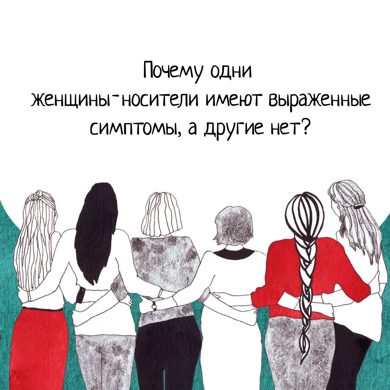 Есть такое понятие — инактивация Х-хромосомы: Х-хромосом у женщины две, если инактивируется участок здоровой Х-хромосомы, ответственный за производство дистрофина, у женщины будут симптомы, если инактивируется участок хромосомы с мутацией в гене дистрофина, то с мышцами все будет в порядке. Может произойти асимметричная инактивация (например, в 75% клеток будет инактивирована здоровая хромосома, а в 25% клеток — поврежденная).